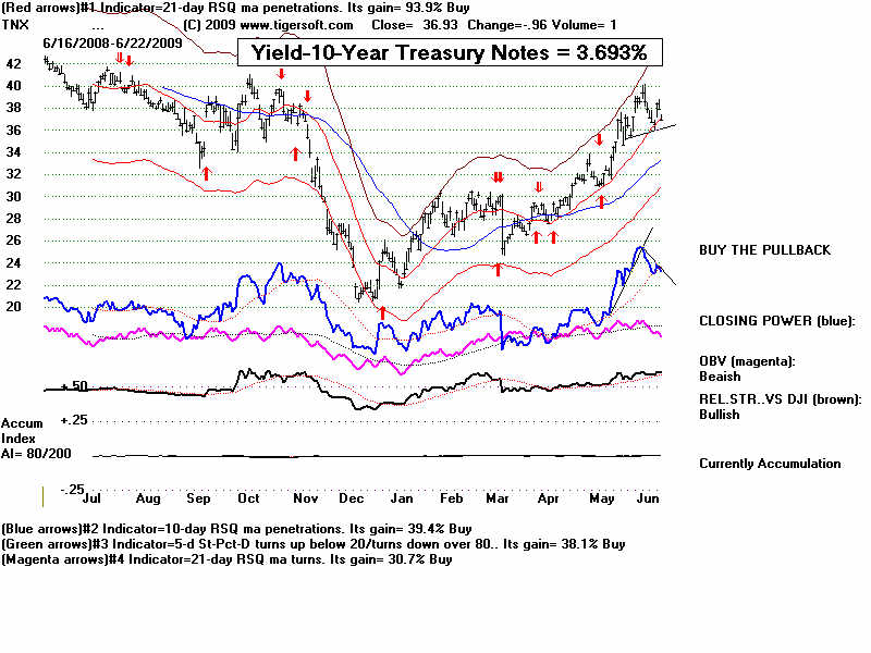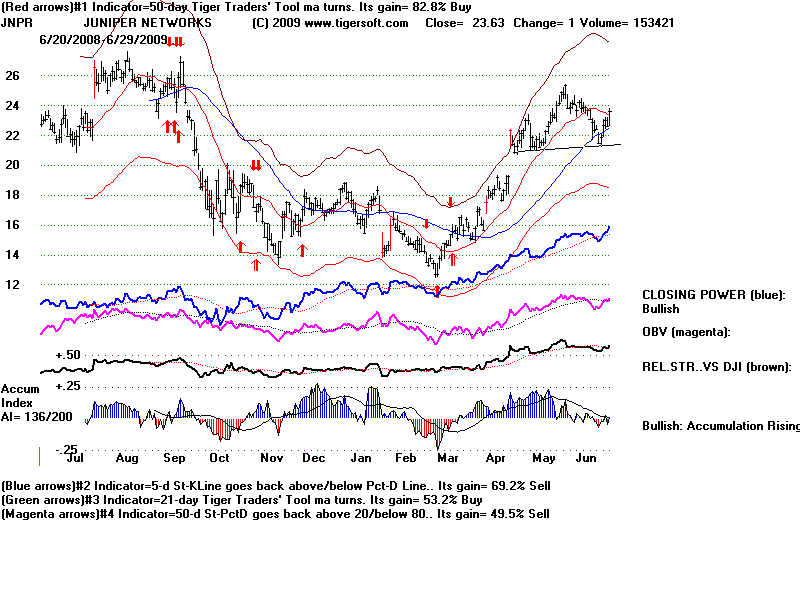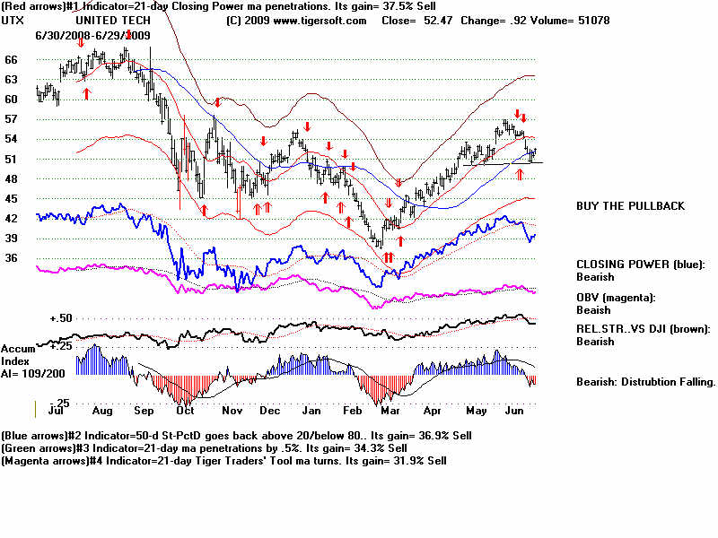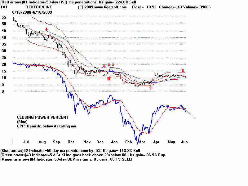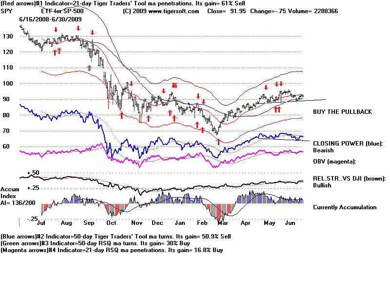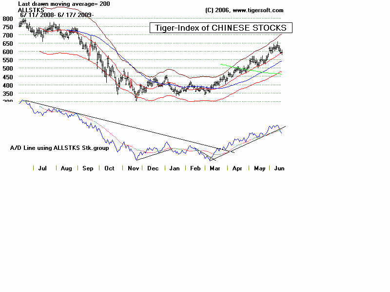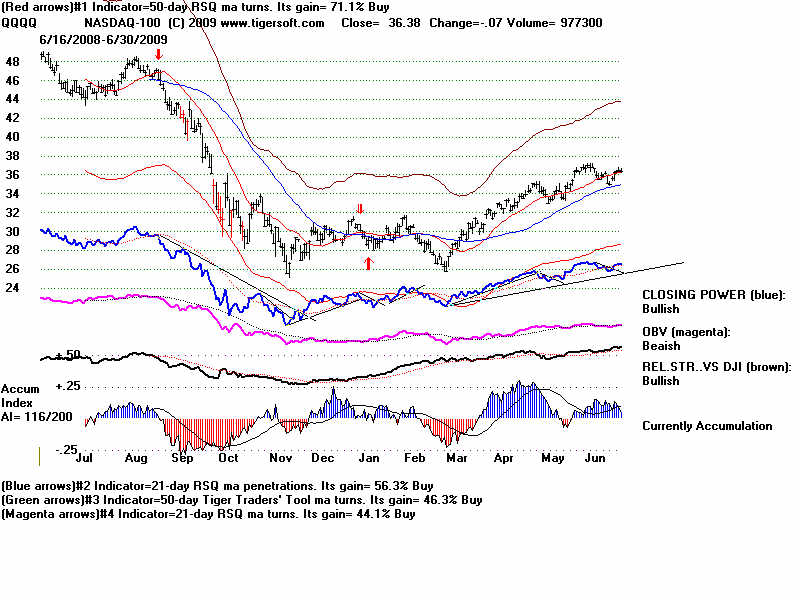 TigerSoft and Peerless Daily Hotline. Tuesday 6 /30/2009 NOTE THIS HOTLINE's IP ADDRESS WILL CHANGE HERE WEDNESDAY NIGHT. You should have been notified about the new address if your subscription is current. Order form to Renew On-Line, "Nightly Peerless/TigerSoft Hotline " ($298) . Previous Hotlines: 5/1/2009 - 6/11/2009 3/30/2009-4/30/2009 (C) 2009, William Schmidt, Ph.D. ![]() Important Notice: Redistribution of any text or concepts here is a violation of copyright laws. This is valuable intellectual property. All violators will be subject to legal action. Please visit www.tigersoft.com Goggle TigerSoft and a technical subject, to get additional examples and a further discussion of concepts and terms used here. See also our Books for sale. . Overnight Market Action: Bloomberg Futures around the world before the US Markets open. Color Codes blue or green = new to this night's report or considered more important black = from a previous night's report Introduction. When reading this HOTLINE, please note the dates that show when the comments in a paragraph or set materials were written. Always read the first comments at the top with the most recent date. They show the Buy or Sell which now applies. Older comments are there entirely for background and to teach TigerSoft and Peerless technical analysis. On a Peerless graph, only the new and latest signal applies. Again, always note the date at the top of a set of paragraphs. INTRODUCTION. Readers, our assessment of the stock market's future trends is based on the following. Google TigerSoft and these subjects to get additional links, besides those shown below. 1) Peerless automatic Buys and Sells for intermediate-term trend. Details of Peerless Signals are given here as they occur. 2) Price charts and moving averages. 3) Closing Power and Closing Power Percent for 2-4 week trends. 4) Accumulation Index to measure support on weakness or distribution on strength. 5) Volume (and OBV to a small extent). 6) Breadth: Advances minus Declines. P-Indicator, A/D Line 7) Stochastics when they are the best trading system. See QQQQ in 2003. 8) Relative Strength - QQQQ/DJI rising is bullish. Compare QQQQ Chart now, on this page, with 2003.. 9) CURRENT Seasonality Updated 6/30 10.) CURRENT Sector Strength/Weakness Analysis. Updated 6/30 11) CURRENT NYSE/NASDAQ New Highs and New Lows. Interesting NH/NL Stocks. Updated 6/30 12) News and Political Economy. See Tiger Blog See also Predicting The QQQQ Using TigerSoft's Opening Power, Closing Power and Tiger's Day Traders' Tool: 1999-2008 |
