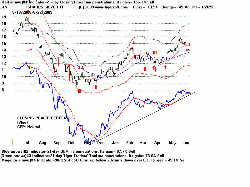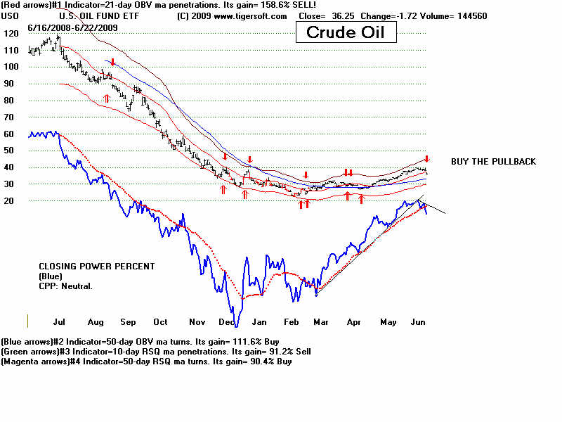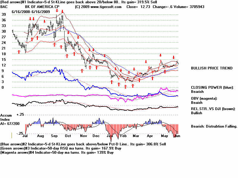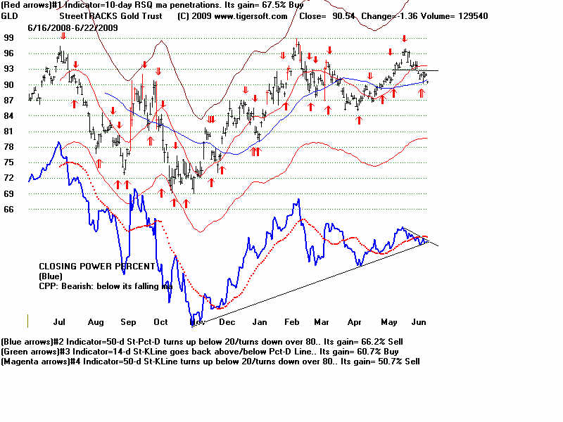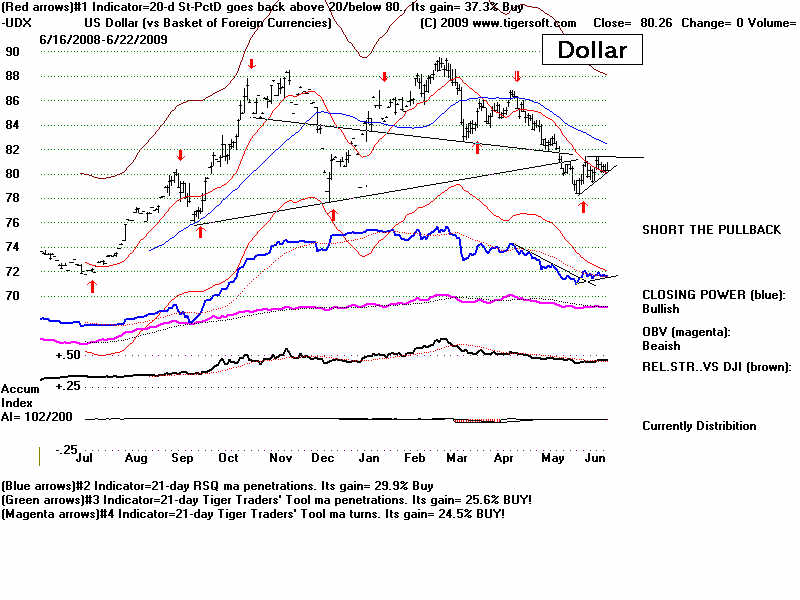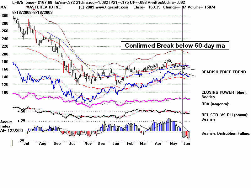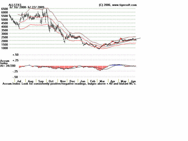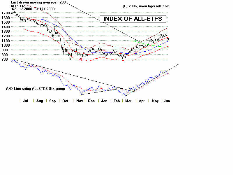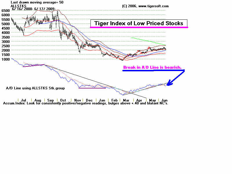 | 6/17/2009 The DJIA remains on a Sell S8. The lower band would seem to be the next target, although a recovery back above the 21-day ma is possible. The most likely scenario would be for the DJI to test 7900-8000. There may emerge two markets from here. Bank stocks and home-building stocks lead the market down while tech stocks and the NASDAQ-100 (QQQQ) are much stronger than the DJIA/ They are trying to bring about a rally from the rising 21-day ma. The QQQQ chart above shows this. Unfortunately, three groups that had been leading the rally seem to be stalling out. The uptrends in the A/D Lines for (1) All Foreign ETFS, (2) Chinese Stocks and (3) Low-Priced Stocks have each been bearishly broken. The global market is now so integrated that weakness in the US is instantly communicated elsewhere. This was the conclusion I reached when studying how well Peerless Buys and Sells worked not just in the US, but everywhere on the planet. There are many High Tech ETFs. Like the QQQQ, they all seem to have a CLosing Power which has fallen to a point where further weakness would break CP uptrends of four or more months. Further below are the charts of three. Watch IWM - just below. It shows a potentially very bearish "Hands above the Head" pattern. A decline by it below 100 would break the patterns neckline. This is a pattern I have only seen in very bearish markets. Another warning, our index of 300+ low priced stocks shows a bearish break in its A/D Line uptrend. Given the volatility of these stocks, this should cause to become guarded in this area. I warned that the break in the NYSE A/D Line would have this effect on secondary stocks. MID-CAPS' Hands Above The Head Pattern. ![]() Merrill Lynch Internet HOLDRs (HHH) ![]() iShares Goldman Sachs Technology Index Fund (IGM) ![]() Merrill Lynch Semiconductor HOLDRs (SMH) ![]() Bank and housing stocks are weakening significantly. The A/D (Advances-Declines) Line of these groups are in downtrends. Watch to see if financial stocks show an ability to rebound from its rising 50-day ma. Tiger Index of Financial Stocks ![]() Tiger Index of Home-Building Stocks ![]() =================================================================================== 6/16/2009 The Sell S8 still operates. The odds favor a test by the DJI of its lower 3.5% band near 8300. A further decline to 7900 of 10% from its highs is more likely looking back at the closest historical parallels. Details of new financial regulations will have to be sifted through by Wall Street, even though Obama's Wall Street friendly minions have set out the details. Congressional reaction will probably produce some populist posturing that may unsettle financial stocks. New weakness is apparent there now. See AXP, BAC, JPM, TRV. Most unsettling, because of what it says about consumer spending, are the confirmed breaks by VISA and MASTER CARD of their 50-day ma. The banks have received most of the government's bailouts. They are making less loans than in the last reported month. VISA HAS BEEN CONTROLLED BY PROFESSIONALS USING A 14-Day STOCHASTIC. WITH A NEW BUY WILL IT CONTINUE TO BE SUPPORTED? ![]() MASTER CARD - AT KEY SUPPORT ![]() A Re-Test of the Lows? The liberal economist JM Keynes would be very disappointed in the meager size of Obama's $85 billion public works program in the US and his decision to waste a trillion on banks and throw more than $150 billion more down civil warring rat-holes half way around the world. A test of the DJI-6500 may yet develop if I'm right that Obama's stimulus package does not begin to correct the vast need for decent-paying American jobs and, worse, that the rally is artificial, having been fueled by TARP payments turned into program trading by banks like Goldman Sachs, which is really a government subsidized hedge fund, and not a bank, anyway. When the banks discover that there is now no one to sell their stock to, prices may start to fall sharply. The memory of the bear market is apt to prompt traders not to hold their shares very tightly if technical supports like the 50-day ma give way. The FED is afraid of Gold surpassing $1000/oz. That would signify a very weak dollar that is probably about to get a lot weaker very quickly. Expect the central bank to try to make it fall back by talking about how inflation is not a problem. But pay more attention to Gold and the Dollar than their words. Every central banker and politician knows that they must say they favor a "strong dollar". From the Fed's viewpoint, and Bernanke in particular, the moment of truth is getting closer where they must choose much higher unemployment and a deepening recession or a much weaker Dollar and significantly higher fuel prices because of the weak Dollar. 5-Year Chart of Gold