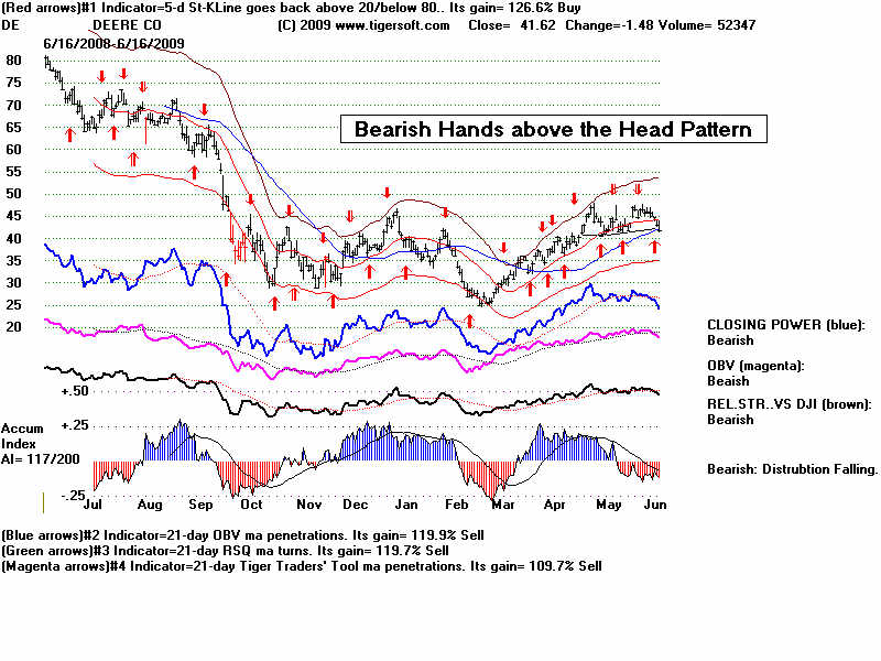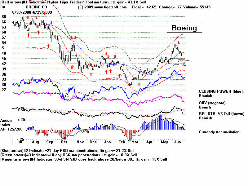 6/26/2009 A Peerless Buy B5 is operative Peerless signal. This signal has always eventually been profitable at the time of the next Peerless sell signal. This weekend's TigerSoft Elite Stock Professional Report has found a very high number of extraordinary volume Buy B12s. There is a lot of evidence that Goldman Sachs program trading is making up a very large proportion of all trading volume. Without fanfare, someone is buying all the most heavily accumulated lower priced stocks with no fanfare. I am reminded of 1968, except that then it was the small investor who was buying. Here is an example. Transcend Medical Transcription Services. ![]() But there is one case when a head and shoulders pattern developed before a Peerless reversing Sell signal. Since we have a potential head and shoulders pattern emerging with the DJI now, we will want to watch to see how it unfolds. Selling if the neckline of the head and shoulders pattern was violated would have worked out better than buying and holding until the next Peerless Sell. Watch also the NYSE A/D Line. The extensive study of head and shoulders shows the usefulness of simply getting out when the A/D Line uptrend is broken if the head and shoulders pattern plays out. See 1948-1949 chart below. For now look at the extensive research I have just done on all head and shoulders patterns since 1915. ![]() ================================================================================= 6/25/2009 Volume was low. B5s are bullish. Look for a rally to the upper band near 9000. There may be resistance at the apex of the right shoulder in a potential head and shoulders pattern. That apex high is 8663. Even if a head and shoulders pattern does develop there is usually temporal symmetry, so that a right shoulder may last as long as 3 weeks, before we get a resolution and either a price breakout above 8680 or a price breakdown below the neckline, the lows just seen. DJI stocks are not where the upside action is. Look at the lengthening list of new highs to get ideas. Most nights you will see some of them above at the Introductory link that that says: 11) CURRENT NYSE/NASDAQ New Highs and New Lows. Interesting Stocks. Some of these are getting quite extended. Find tech stocks showing lots of accumulation with a CLosing Power making new highs ahead of price. Some examples are EMC, MXIM and QCOM. 6/24/2009 Buy B5 Is Operative Peerless Signal The hot money is still going into low-priced stocks showing bulging Accumulation and making new highs. The sense that the Fed will guarantee the market against a worse decline gives lots of help to speculative stocks. In many ways, this boom in low priced stocks is the equivalent of the Fed induced boost to technology stocks in 1999-2000 and housing stocks from 2002-2004. See some more examples of Explosive Super Stocks Today and read the Blog I wrote on June 6th. The Great 2009 Bull Market. Why Is Wall Street Concealing The Huge Surges in Low Priced Stocks? I think it is very bullish for a few more months that hot money chooses to buy low-priced stocks rather than drive prices down by buying leveraged short ETFs. Say what you will about Goldman Sachs manipulating stock prices, even creating the booms and then the busts in a very big way. I would much rather have them buying than selling short. Read The Rolling Stone's Goldman Sachs: "Engineering Every Major Market Manipulation Since The Great Depression" Compare it with the points I have been trying to make about Goldman's sinister dominance of | US government economic policy making since the early 1994. Since 1965, the DJI has risen 61.4% of the time in the 10 trading days following June 25th. New investment money is most apt to come into the market the last few trading days of the month and for a week after the first. With June's end comes 2nd quarter window-dressing. That boost the strongest stocks. Low priced stocks and technology are not the only ones favored. Since the market turned up the six biggest gain Fidelity Sector funds are: Automotive +136% Paper-Forest +67% Brokerage +63% Financial +57% Networking Infrastructure +50% Technology +48% Half the time in the past the DJI retreats 2% to 8% before making a significant recovery following a Buy B5. Waiting for the Closing Power to break its downtrendline in what you Buy may prove a reasonable course of action. But it also will force traders to buy on strength. Buying the strongest of the general market ETFs would not have put you in the weak DIA. Unlike the DIA, the QQQQ closed above it opening. That there were almost 3 times more stocks rising today than falling stock is certainly a positive sign. The DJI was much weaker. Its first hour 100 point jump and later 150 point fade is clearly bearish action. Will its action continue? Who were the sellers for the last 4 hours? It may well be that the DJI's weakness today owed to news which will not affect the whole financial world. Much of the weakness in the DJI-30 today owed to the 6% drop in Boeing, which announced serious delays in its new 787 aircraft. The second biggest loser in the DJI was UTX. The Motley Fool explains: "A whole string of suppliers -- from Honeywell (NYSE: HON) to United Tech (NYSE: UTX) to Spirit Aerosystems (NYSE: SPR) -- depend on Boeing getting its act together so that they can bring parts operations up to speed. Meanwhile, customers such as Continental (NYSE: CAL) and AMR (NYSE: AMR), parent company of American Airlines, who have ordered large batches of 787s, need the plane desperately in order to cut their fuel costs. A market recovery is expected. But watch to see if the leaders can get past the apex of . potential right shoulders in what would become bearish head and shoulders tops if their rally fizzles. Here are some examples of ETFs and stocks that could become bearish head and shoulders if prices cannot get past the lines shown. ![]() ![]() ![]() ![]() =================================================================================