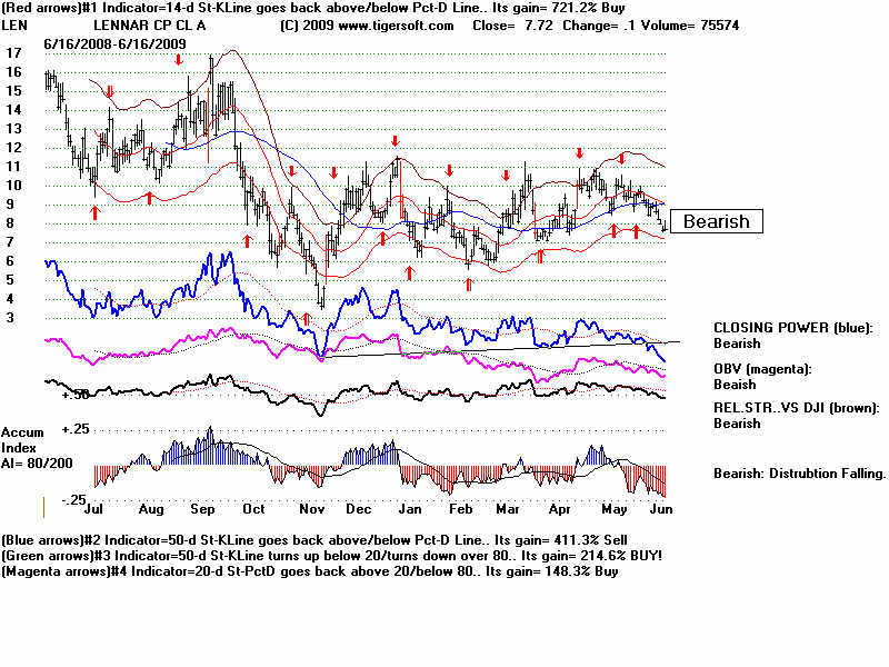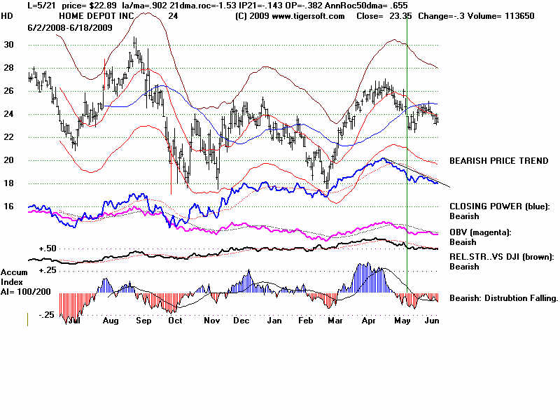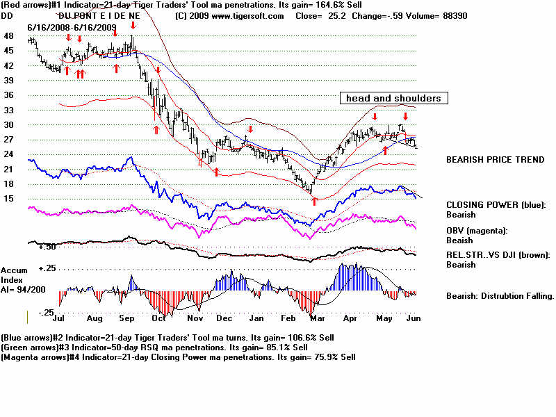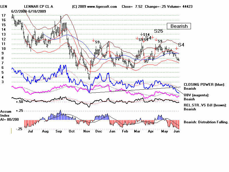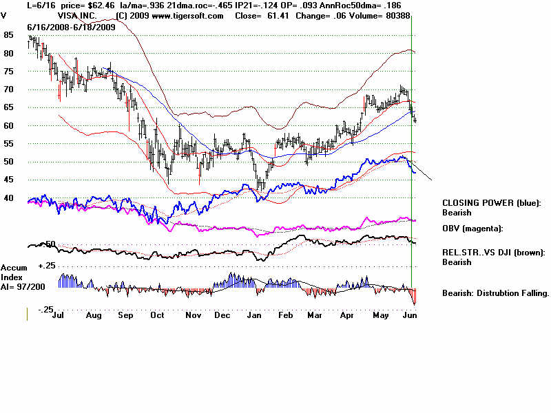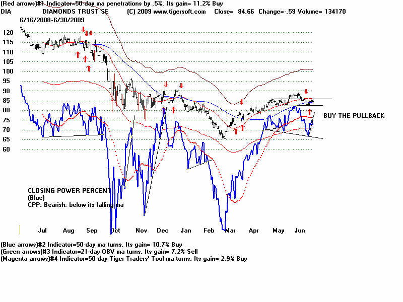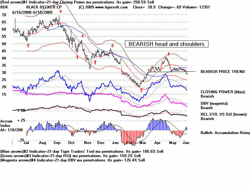 The DJIA has slightly penetrated its 21-day ma. A rebound from here cannot be ruled out. But the Sell S8 is much more likely to bring a further decline when the DJI is not near an all-time high and is instead rebounding off a bear market low. Note the break in the NYSE A/D line and the poor breadth today. In addition, the DIA's Closing Power is falling, as is SPY's. (See these two charts just below). The QQQQ has broken its steep Closing Power uptrend. It is testing its less steep uptrend. It seems bound to test its rising 50-day ma. There are a growing number of stocks that look bearish. Their breaking the 50-day ma with a negative Accumulation Index and falling Closing Power are reliable signs of a decline. Only about 15% of stocks, I reckon now, show this. Here are some cases to study, if you want to see what TigerSoft considers bearish. Vulnerable Looking Stocks BAC - heavy distribution and falling Closing Power. BDK - Completed continuation head and shoulders pattern. C - Bleak internals. Only Obama bailouts will save it. Political opposition is growing to this. Watch COF- Capital One - to see if it can stay above its blue 50-da ma with such weak internals. Home Builder CTX has a bearish confirmed 50-day ma penetration. DD in DJIA shows a bearish head and shoulders pattern with distribution on right shoulder. John Deere shows a reliably bearish hands above the head pattern. Watch FCX to see if metals prices are going to drop as world demand slows up. Federal Express - confirmed breakdown below 50-day ma. Why is Public buying GE at opening so aggressively and professionals selling even more so? JP Morgan -confirmed breakdown. Home-builder KBH shows a bearish head and shoulders pattern and confirmed breakdown. Home-builder LEN shows a bearish confirmed breakdown. Conglomerate TXT shows a bearish confirmed breakdown. United Parcel Service is being hit by a double whammy: falling consumer demand and rising oil prices. In this environment, we should wait for a new Peerless Buy signal. Seasonality remains bearish. Since 1965, the DJI has risen only 34.1% of the time over the week following June 16th and 40.9% of the time over the next two weeks. ![]() 6/15/2009 The V-Indicator has dropped below its declining 21-day ma in the vicinity of a falling 200-day ma. The V-Indicator's 21-day ma is also negative. That does not look good. A decline by the DJI to 8300 and lower band are likely to give new Buys as long as the Accumulation Index and P-Indicator remain positive. The P-Indicator stands at +229, which gives it some cushion to stay positive if the DJI should fall another 3.5% to the lower band now at 8275 and rising 20 points a day. The Accumulation Index is at .056. This also provides a cushion for the market on a further decline. The DJI now stands .5% above its rising 21-day ma 40 points below today's close. Will the rising 21-day ma be violated? Initially I thought that we might get some idea of what to expect here by looking all the cases where there is a test of that ma within 2 months of a B18, which is what we had here 3 weeks ago. That reflects the very good breadth. I estimate that declines more than a two percent below the 21-day ma take place in the two months after a Buy B18 only in about 25% of all cases. In about 14% of the cases, the DJI falls below the lower 3.5% band within 3 months of a Buy B18. Of course, we have a unique market. Breadth has been unusually bullish. But the depth of the bear market has badly shaken confidence. To start a real bull market, we will probably need a re-test some level nearer 7500 or even 6500. Today, there was a clear break in the NYSE A/D Line and that has in the past reliably confirmed an Sell S8. Further analysis shows that the Sell S8 may cancel the bullishness of the previous B18. When there was also a Sell S8, a decline to at least the the lower.band always occurred, despite the B18. Look at the only cases, 3 instances, where there was a B18 AND a Sell S8. Interestingly, in two cases the DJI declined 10% and in one cases the DJI fell to the lower band twice before starting much of a rally. A 10% decline here would take the DJI to 7900. =============== 1946 ===================== ![]() ================ 1950 ======================== ![]() ================ 1975 ======================== ![]() 6/14/2009 Watch Breadth This Week Closely. Very Weak Breadth Would Confirm The New Sell S8. Peerless Still Operates on a Buy, unless you wish to use the tentative Sell S8 discussed last week. In 7 of 10 cases the DJI fell at least 9% after this signal. So, it is important. It is confirmed by weak breadth (NYSE advances - declines). The new signal needs a real-time test to be adopted. Since the NYSE A/D Line still is in a steep rising trend, it's probably best to adopt a wait and see attitude. But broad weakness all day Monday will break the A/D Line uptrend. That would make the S8 look like it did in 1932, 1933, 1935, 1939 and 1975.