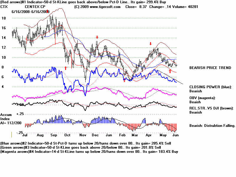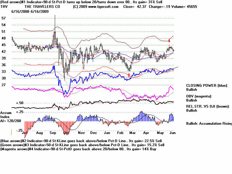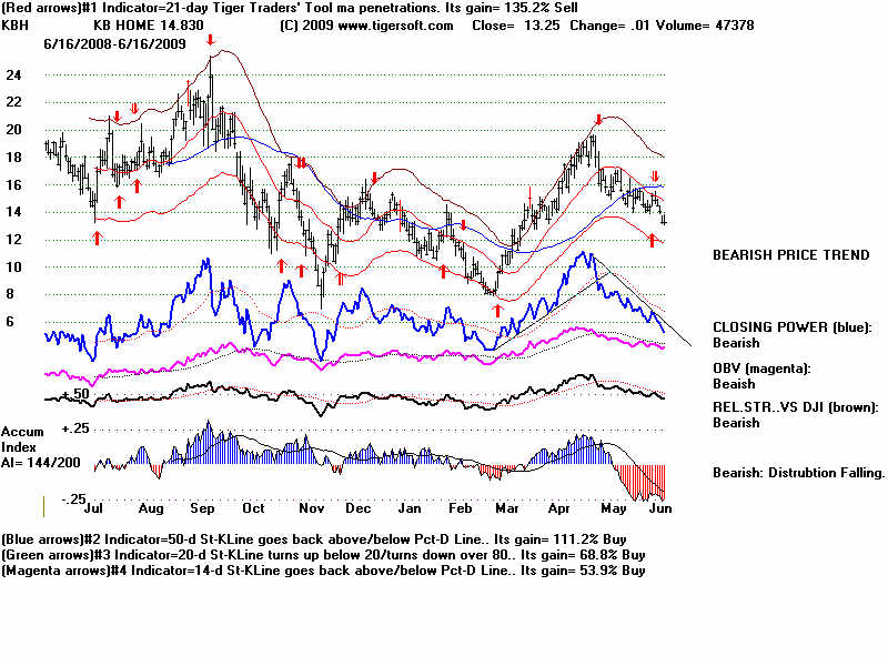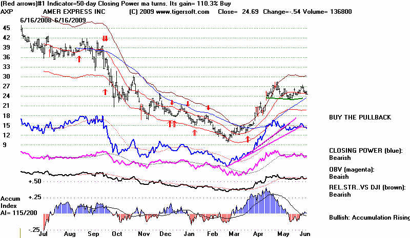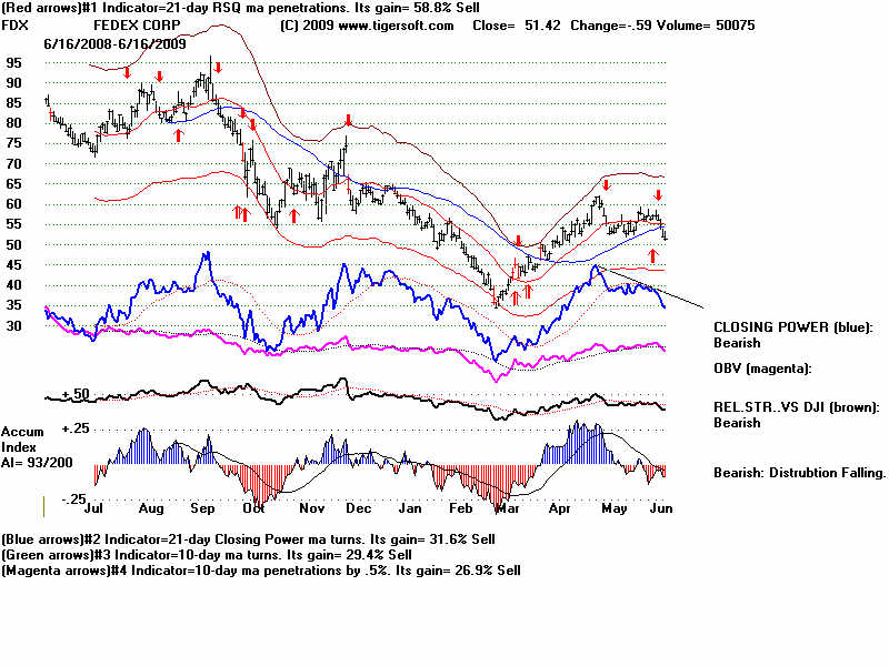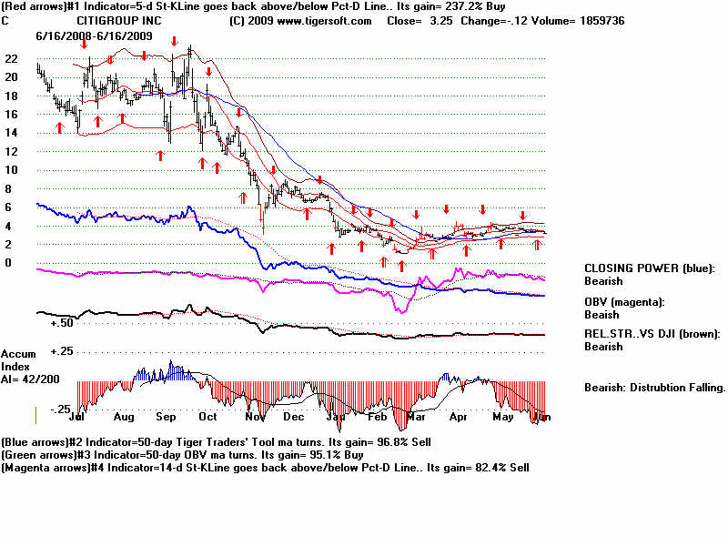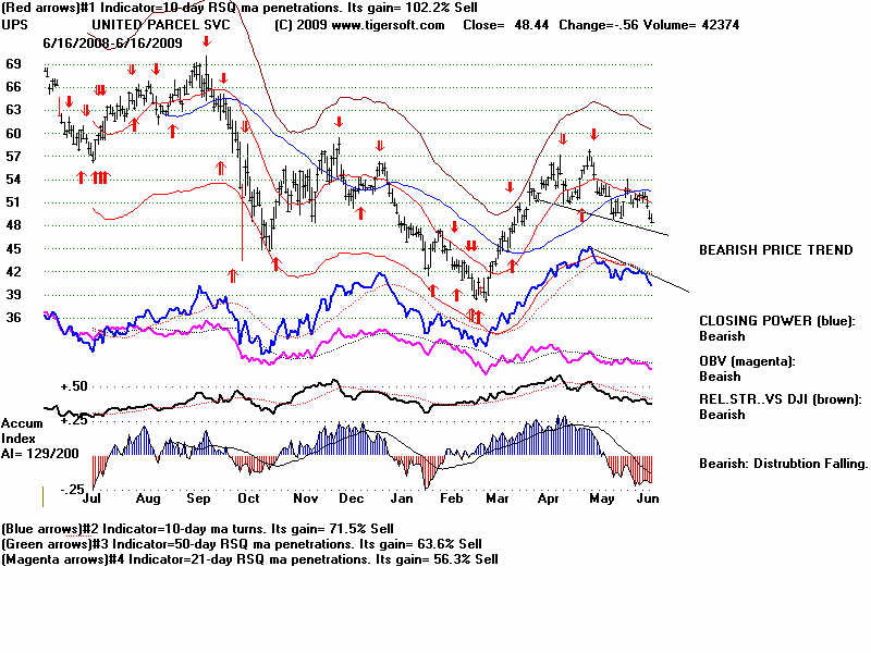 The DJIA has slightly penetrated its 21-day ma. A rebound from here cannot be ruled out. But the Sell S8 is much more likely to bring a further decline when the DJI is not near an all-time high and is instead rebounding off a bear market low. Note the break in the NYSE A/D line and the poor breadth today. In addition, the DIA's Closing Power is falling, as is SPY's. (See these two charts just below). The QQQQ has broken its steep Closing Power uptrend. It is testing its less steep uptrend. It seems bound to test its rising 50-day ma. There are a growing number of stocks that look bearish. Their breaking the 50-day ma with a negative Accumulation Index and falling Closing Power are reliable signs of a decline. Only about 15% of stocks, I reckon now, show this. Here are some cases to study, if you want to see what TigerSoft considers bearish. Vulnerable Looking Stocks BAC - heavy distribution and falling Closing Power. BDK - Completed continuation head and shoulders pattern. C - Bleak internals. Only Obama bailouts will save it. Political opposition is growing to this. Watch COF- Capital One - to see if it can stay above its blue 50-da ma with such weak internals. Home Builder CTX has a bearish confirmed 50-day ma penetration. DD in DJIA shows a bearish head and shoulders pattern with distribution on right shoulder. John Deere shows a reliably bearish hands above the head pattern. Watch FCX to see if metals prices are going to drop as world demand slows up. Federal Express - confirmed breakdown below 50-day ma. Why is Public buying GE at opening so aggressively and professionals selling even more so? JP Morgan -confirmed breakdown. Home-builder KBH shows a bearish head and shoulders pattern and confirmed breakdown. Home-builder LEN shows a bearish confirmed breakdown. Conglomerate TXT shows a bearish confirmed breakdown. United Parcel Service is being hit by a double whammy: falling consumer demand and rising oil prices. In this environment, we should wait for a new Peerless Buy signal. Seasonality remains bearish. Since 1965, the DJI has risen only 34.1% of the time over the week following June 16th and 40.9% of the time over the next two weeks. ![]() 6/15/2009 The V-Indicator has dropped below its declining 21-day ma in the vicinity of a falling 200-day ma. The V-Indicator's 21-day ma is also negative. That does not look good. A decline by the DJI to 8300 and lower band are likely to give new Buys as long as the Accumulation Index and P-Indicator remain positive. The P-Indicator stands at +229, which gives it some cushion to stay positive if the DJI should fall another 3.5% to the lower band now at 8275 and rising 20 points a day. The Accumulation Index is at .056. This also provides a cushion for the market on a further decline. The DJI now stands .5% above its rising 21-day ma 40 points below today's close. Will the rising 21-day ma be violated? Initially I thought that we might get some idea of what to expect here by looking all the cases where there is a test of that ma within 2 months of a B18, which is what we had here 3 weeks ago. That reflects the very good breadth. I estimate that declines more than a two percent below the 21-day ma take place in the two months after a Buy B18 only in about 25% of all cases. In about 14% of the cases, the DJI falls below the lower 3.5% band within 3 months of a Buy B18. Of course, we have a unique market. Breadth has been unusually bullish. But the depth of the bear market has badly shaken confidence. To start a real bull market, we will probably need a re-test some level nearer 7500 or even 6500. Today, there was a clear break in the NYSE A/D Line and that has in the past reliably confirmed an Sell S8. Further analysis shows that the Sell S8 may cancel the bullishness of the previous B18. When there was also a Sell S8, a decline to at least the the lower.band always occurred, despite the B18. Look at the only cases, 3 instances, where there was a B18 AND a Sell S8. Interestingly, in two cases the DJI declined 10% and in one cases the DJI fell to the lower band twice before starting much of a rally. A 10% decline here would take the DJI to 7900. =============== 1946 ===================== ![]() ================ 1950 ======================== ![]() ================ 1975 ======================== ![]() 6/14/2009 Watch Breadth This Week Closely. Very Weak Breadth Would Confirm The New Sell S8. Peerless Still Operates on a Buy, unless you wish to use the tentative Sell S8 discussed last week. In 7 of 10 cases the DJI fell at least 9% after this signal. So, it is important. It is confirmed by weak breadth (NYSE advances - declines). The new signal needs a real-time test to be adopted. Since the NYSE A/D Line still is in a steep rising trend, it's probably best to adopt a wait and see attitude. But broad weakness all day Monday will break the A/D Line uptrend. That would make the S8 look like it did in 1932, 1933, 1935, 1939 and 1975.